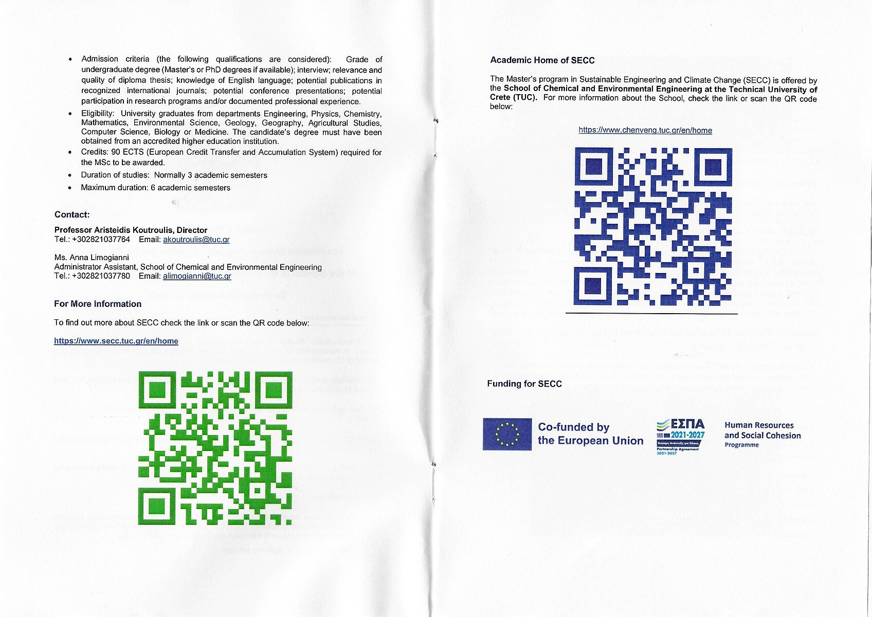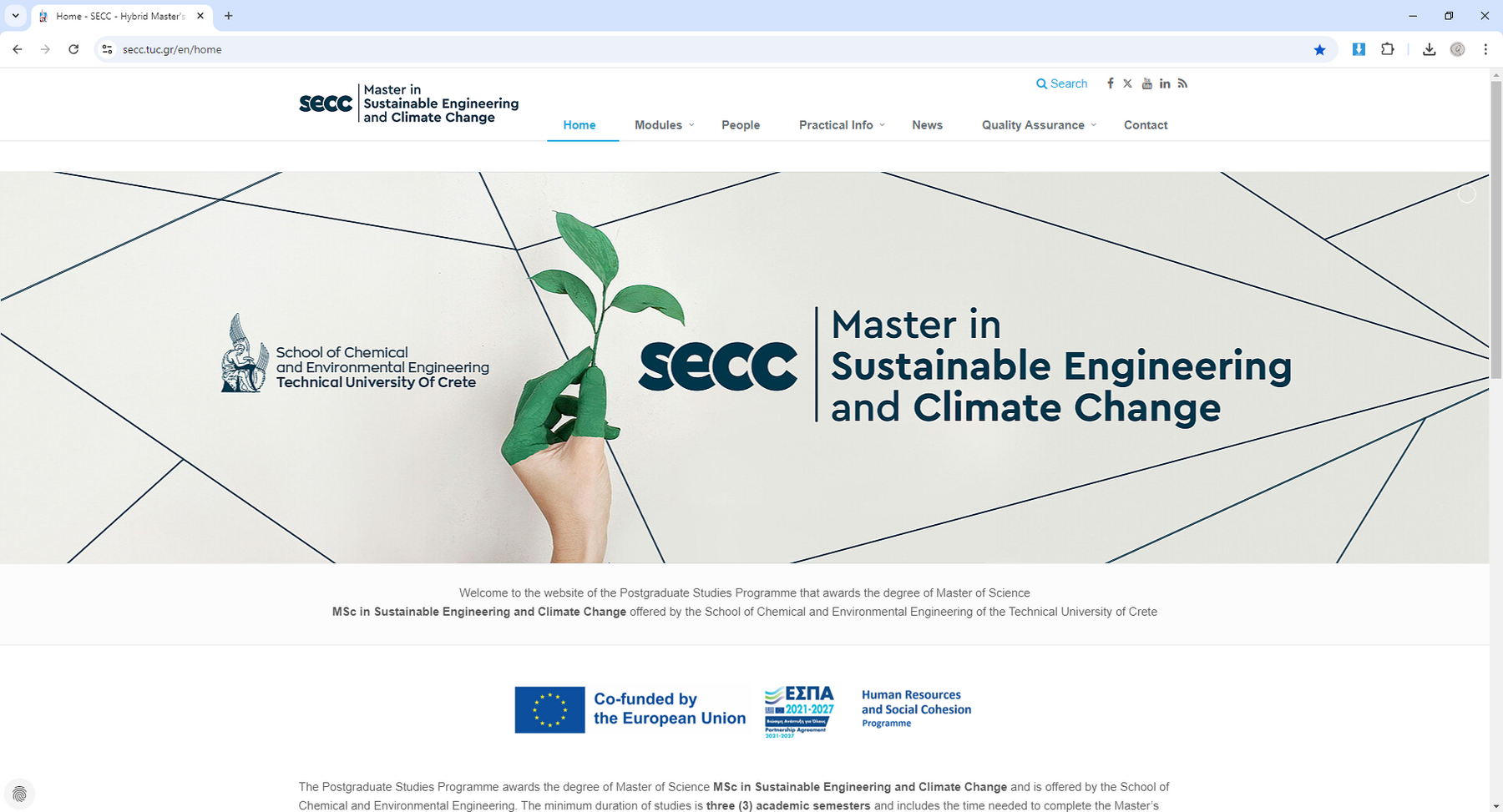 Στα πλαίσια του Υποέργου (2) «Στήριξη διεθνοποίησης προγράμματος ανώτατης εκπαίδευσης της Σχολής Χημικών Μηχανικών και Μηχανικών Περιβάλλοντος του Πολυτεχνείου Κρήτης», ΚΑΕ 82658 της Πράξης «Υποστήριξη Δράσεων Διεθνοποίησης του Πολυτεχνείου Κρήτης (μεταφερόμενη Πράξη της ΠΠ 2014-2020)» με Κωδικό ΟΠΣ 6004795 στο Πρόγραμμα «Ανθρώπινο Δυναμικό και Κοινωνική Συνοχή 2021-2027», για το προσφερόμενο από τη Σχολή Χημικών Μηχανικών και Μηχανικών Περιβάλλοντος Ξενόγλωσσο Πρόγραμμα Μεταπτυχιακών Σπουδών «Αειφόρος Μηχανική και Κλιματική Αλλαγή-Sustainable Engineering and Climate Change», υλοποιήθηκαν δράσεις με στόχο την στήριξη της διεθνοποίησης του ΞΠΜΣ: